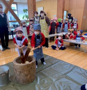 入居者の皆さんと一緒に、たんぽぽこども園の園児(年長クラス23人)と、近隣の関係者(ケアマネさん)も参加し、賑やかな餅つきになりました🎉