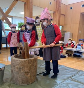 ご利用者の掛け声に合わせて、餅をつき始めると、後ろのこどもたちもワクワクしながら順番待ちをしてます。
